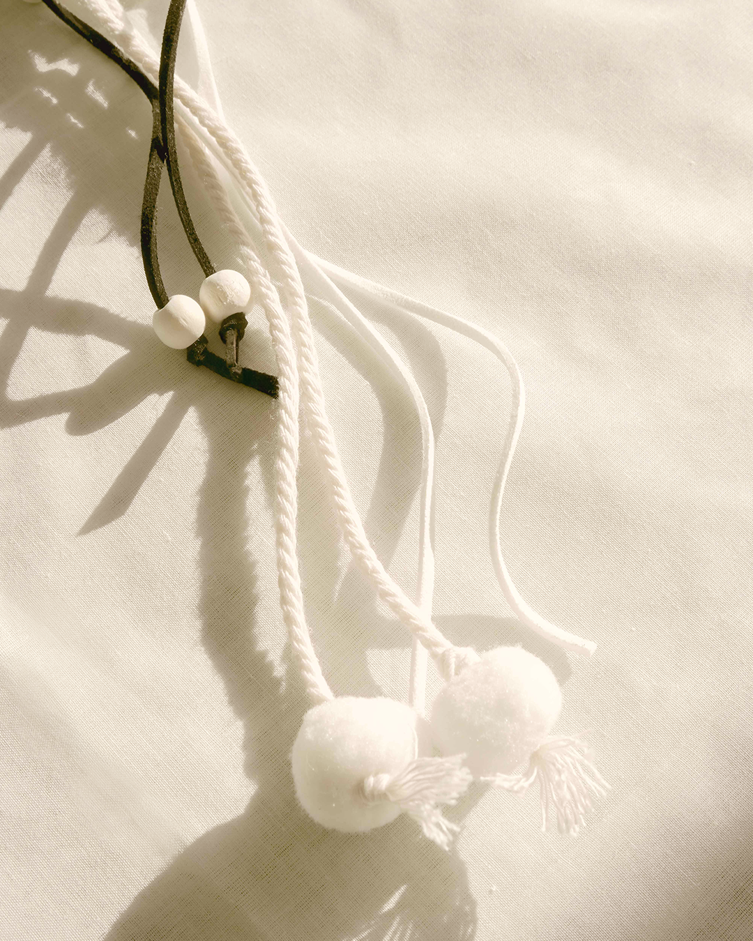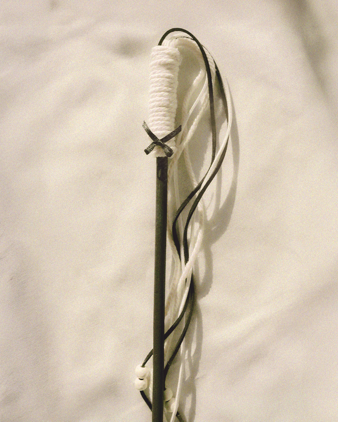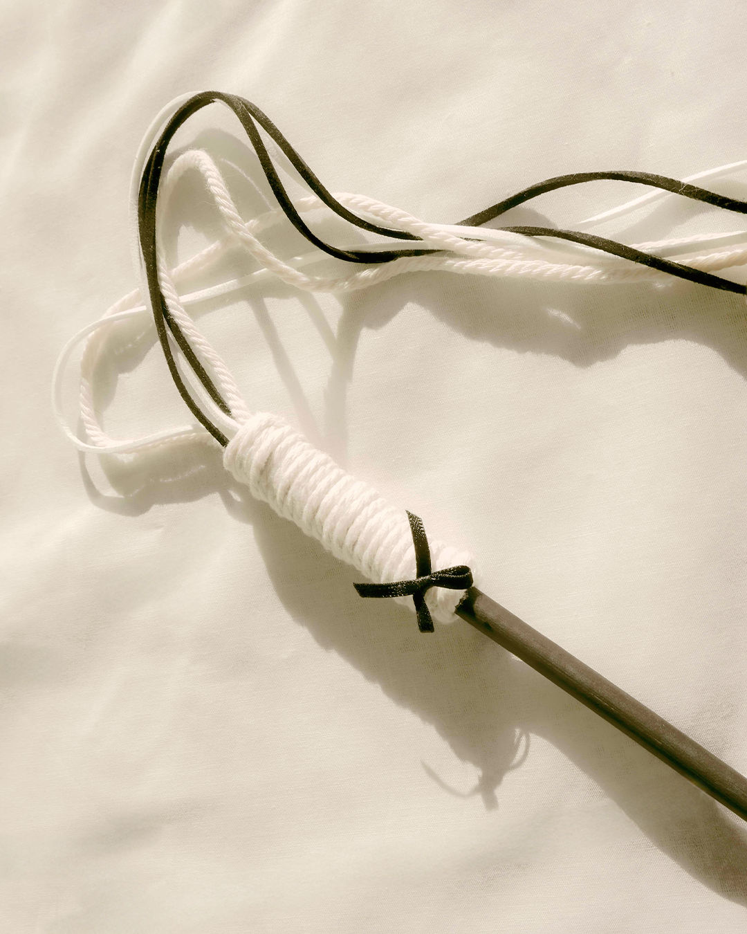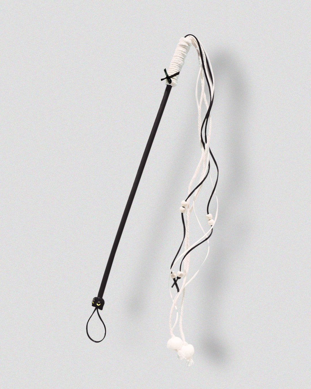 Taro features a wood dowel paired with black and white suede strips, offering a soft texture and gentle movement that encourages chasing and pouncing.